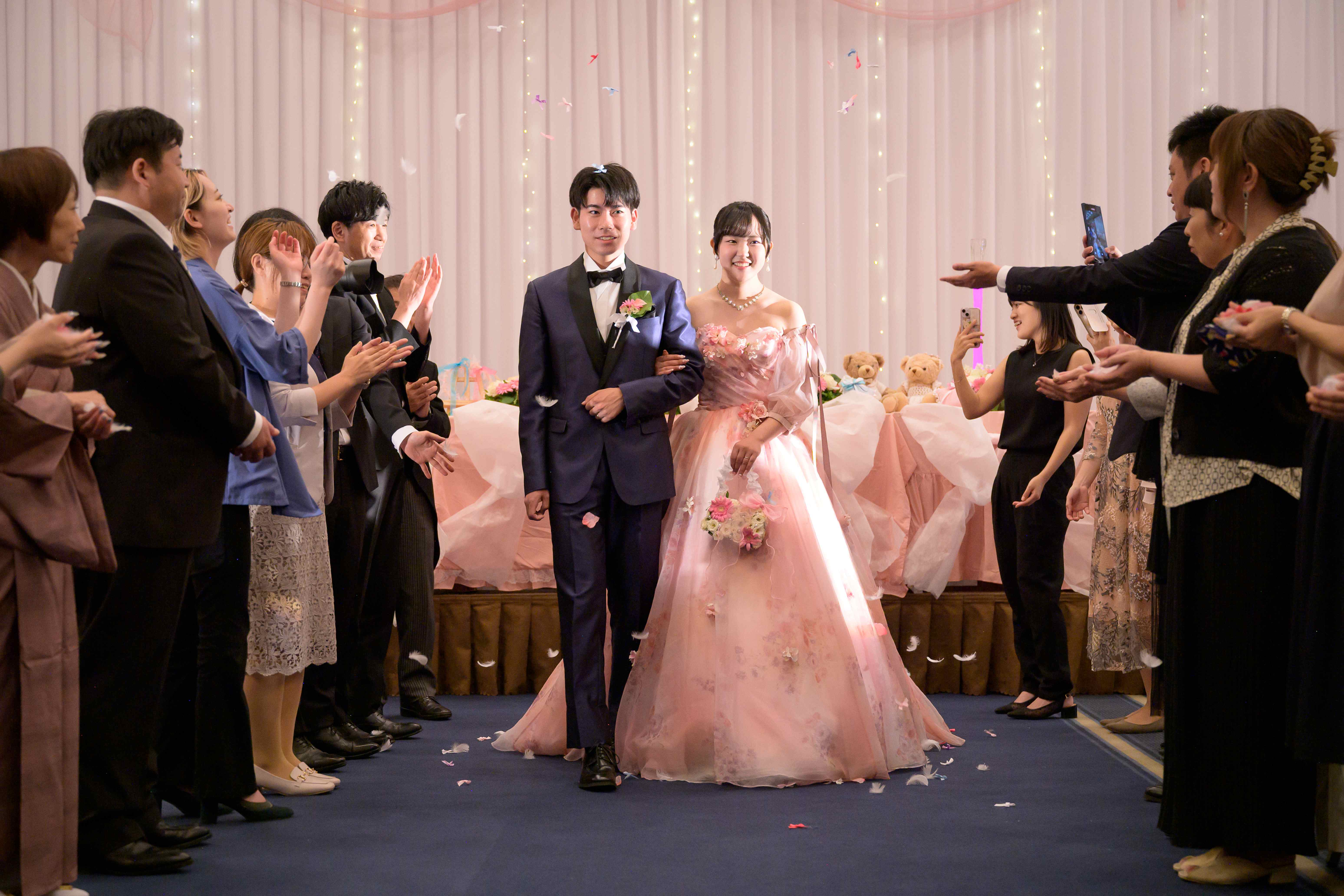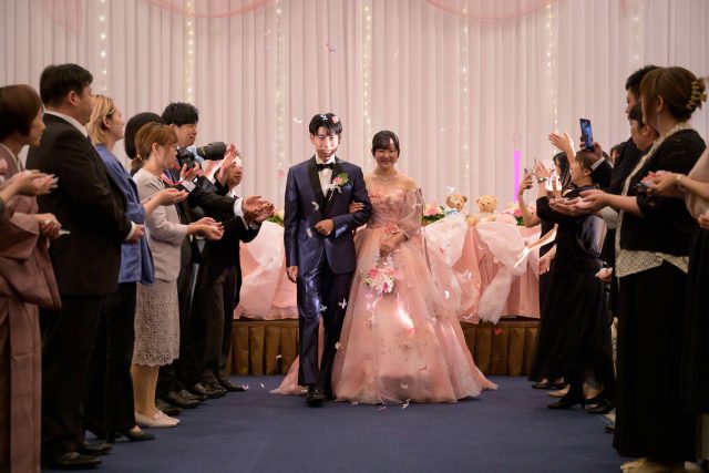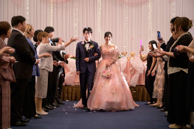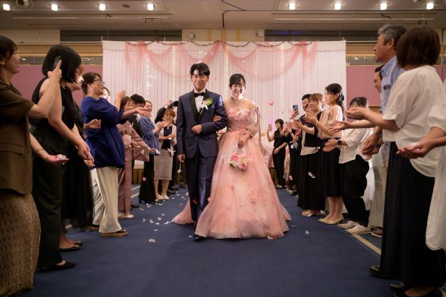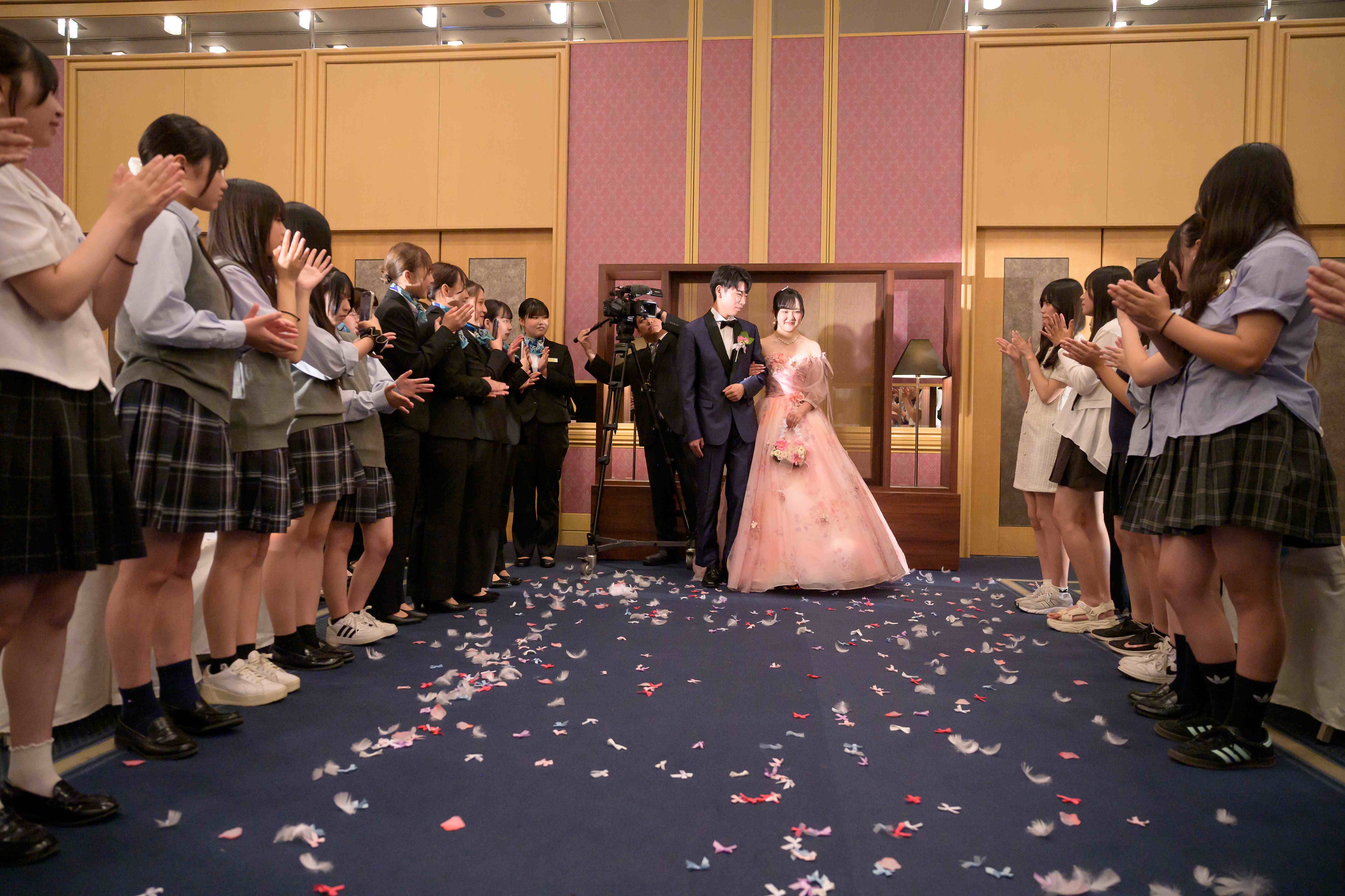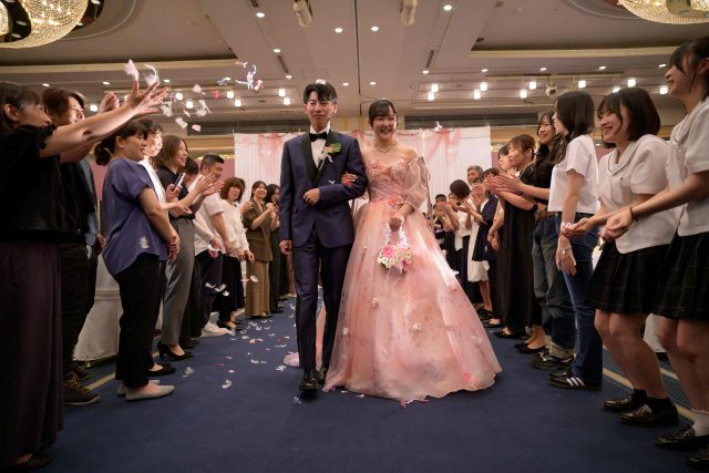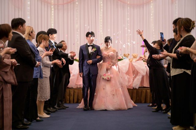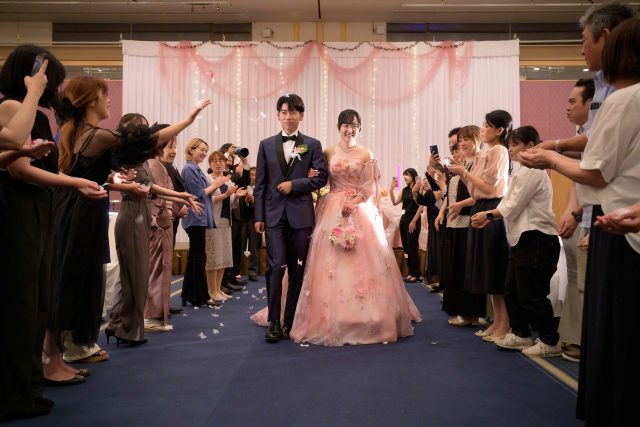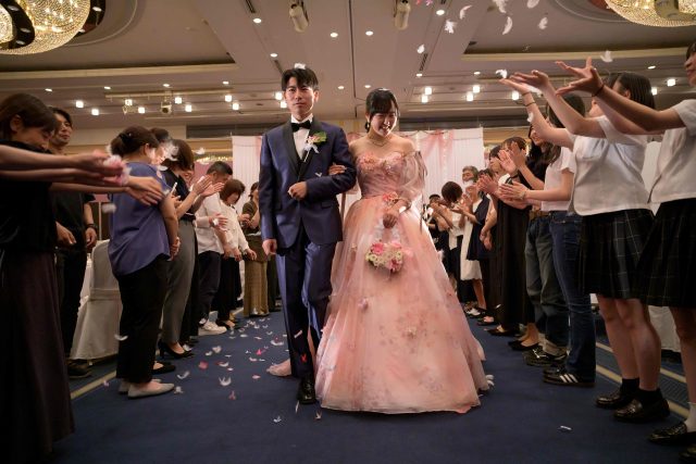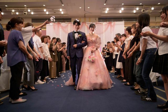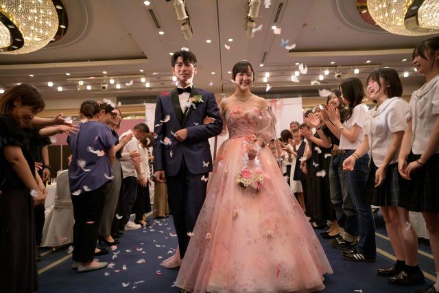 ゲストのみなさんから祝福のリボンシャワーを浴びながら退場です!