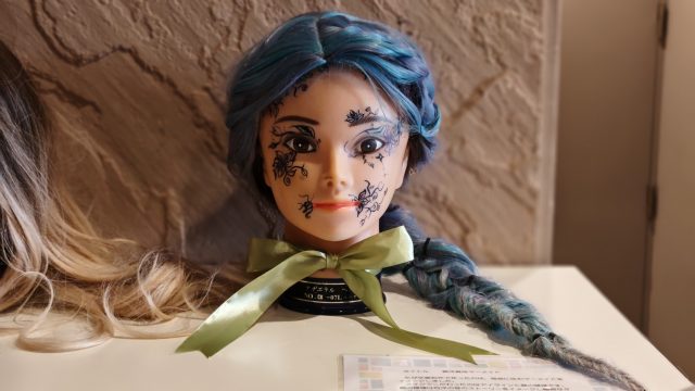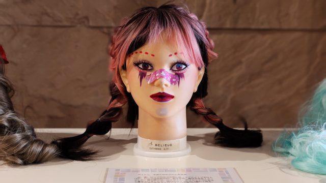 メイクでこだわったのはアイラインと顔の模様です。顔の模様は西洋の昔のストーリーをイメージし繊細なタッチで曲線的に描きました。花の模様はふんわりと海の中に浮かぶ感じに仕上げ、葉っぱやつるもゆらゆら浮かぶ感じにこだわりました。近くで見ると繊細できれいなのでよく見てください。