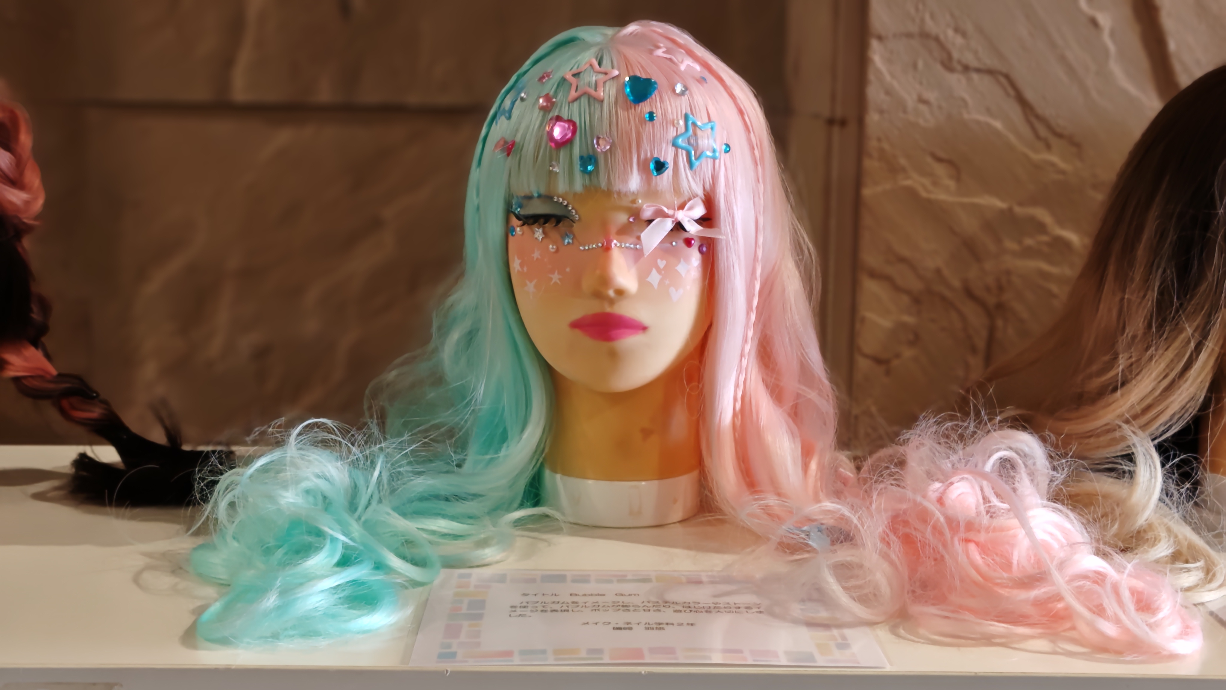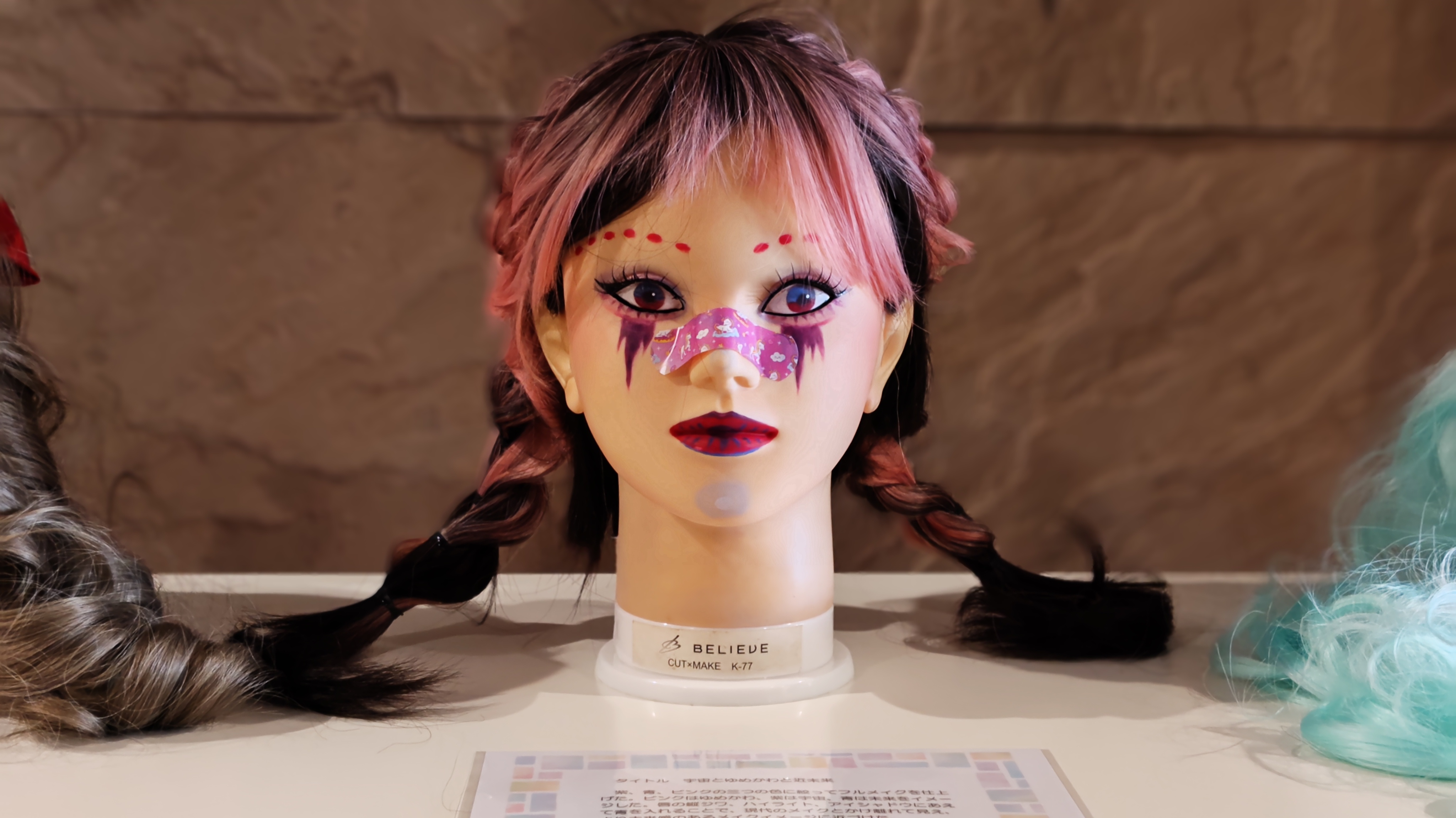 紫、青、ピンクの三つの色に絞ってフルメイクを仕上げた。ピンクはゆめかわ、紫は宇宙、青は未来をイメージした。唇の縦ジワ、ハイライト、アイシャドウにあえて青を入れることで、現代のメイクとかけ離れて見え、より未来感のあるメイクイメージに近づけた。